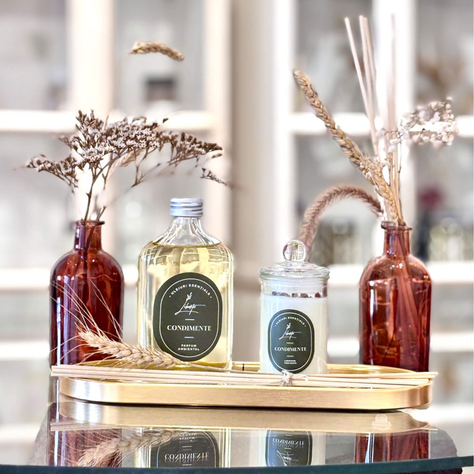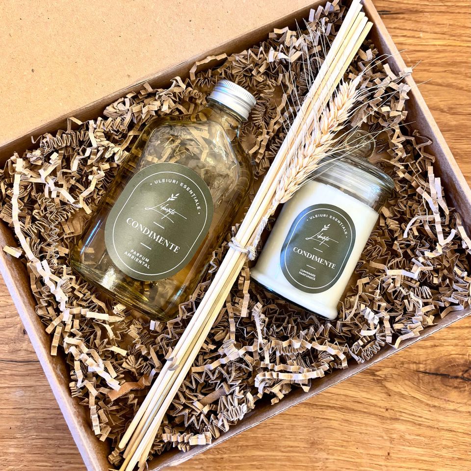 „Condimente” evocă atmosfera vibrantă și caldă a unui bazar oriental: scorțișoară, cuișoare, anason și enibahar. Această combinație caldă și reconfortantă stimulează simțurile și aduce un plus de energie pozitivă și confort psihic. În pachetul cadou, mireasma se exprimă în două forme complementare: difuzorul cu bețișoare pentru parfumare continuă și lumânarea parfumată turnată manual, pentru momente de relaxare și meditație.